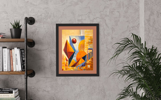 • Abstract painting with a blue hand-like shape surrounded by warm colors